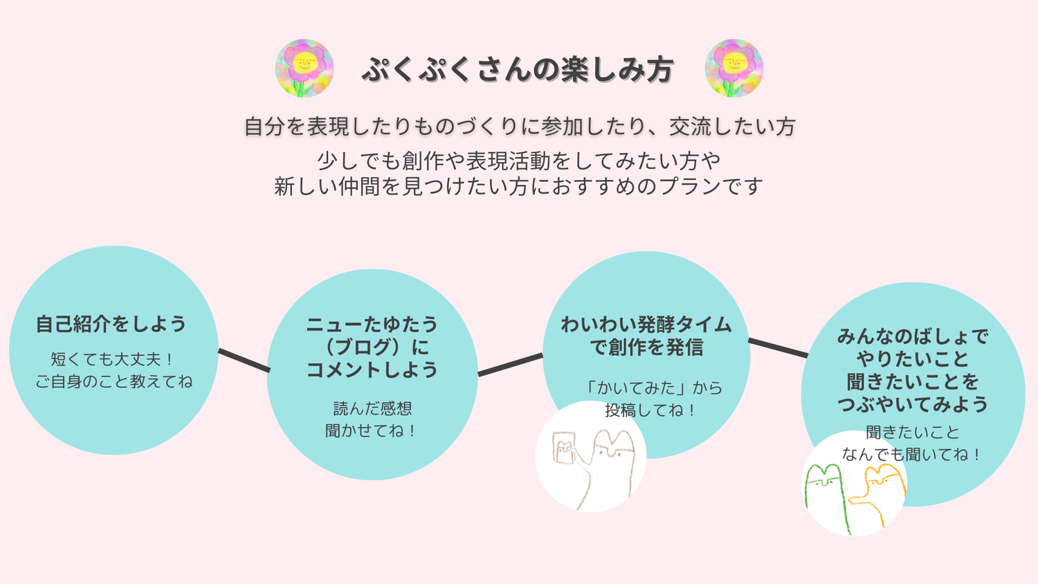 みんなの才能がここで、ぷくぷくと発酵して、福福になっていくことを願ってつけました。表現方法は絵に限らず、自由!