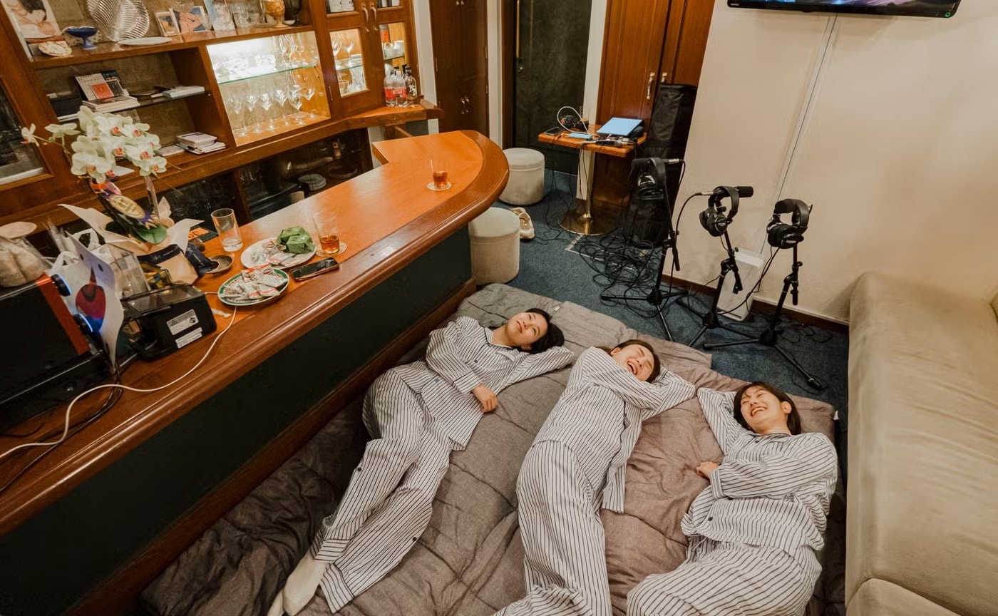 ゲストに20代でスナックを開業したというJuriaさんをお迎えして、実際に銀座のお店のカーペットの上に寝袋を敷かせてもらい、開業に至ったこれまでのストーリーや元々趣味だった旅行のお話を聞かせていただきました。同い年のJuriaさんが、開業を決断したこと、自身の全てがお店につながっているから楽しいと言う、そのはずむ声色を聞いていると、私も「ぷくぷく」してくる気がします。
