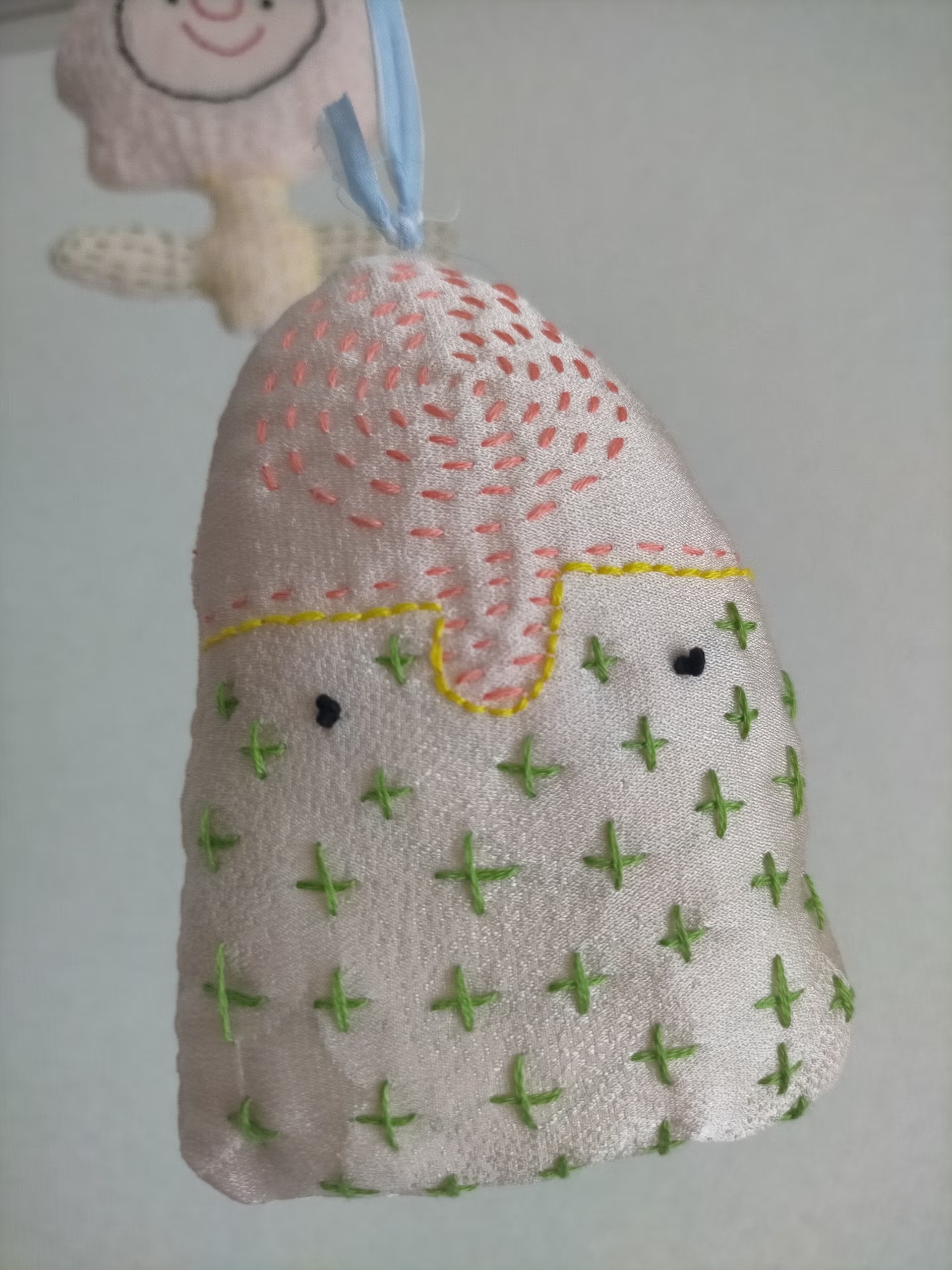もふん太郎とお花ちゃん?は、シルク生地を以前にヨモギかツツジで染めたものを使いました。