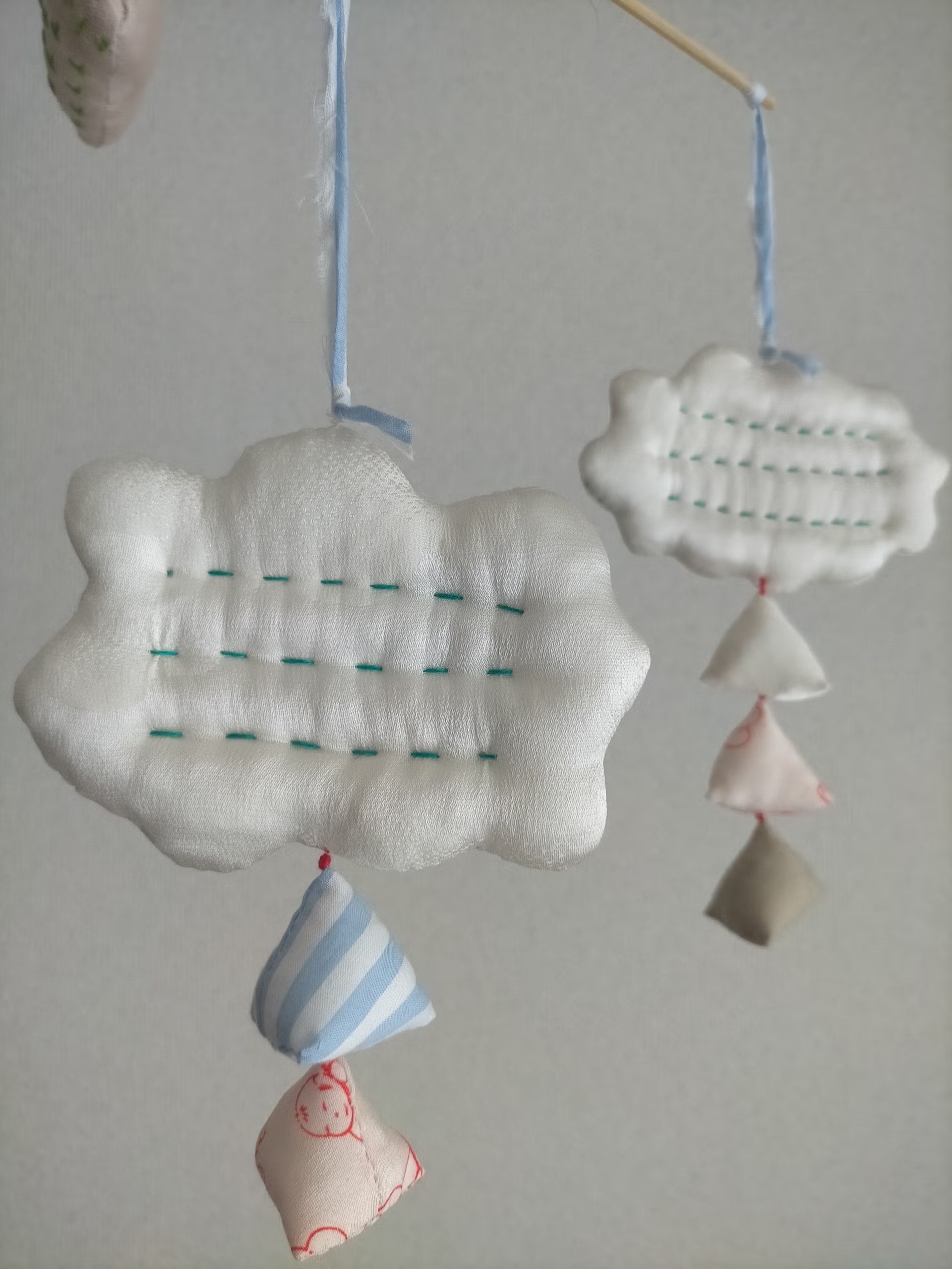 雲きょうだいは、もふん太郎とお花と同じ生地です。こちらは染める前の元のシルク生地で作りました。